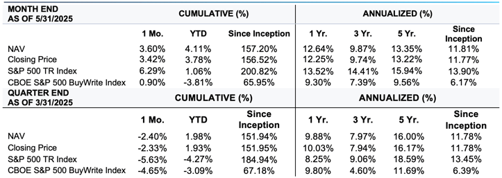 During May no new companies were added to the Fund but existing holdings were added to during several periods of weakness or after being called away. Coca-Cola (KO), IBM (IBM), Meta Platforms (META) and RTX Corp (RTX) were added to while American Express (AXP), Caterpillar (CAT) and Microsoft (MSFT) were added back after being called away. As mentioned earlier, the Fund exited its position in UnitedHealth (UNH) in May with an eye on new opportunities to deploy that capital in the Health Care sector and elsewhere as attractive entries present themselves.
