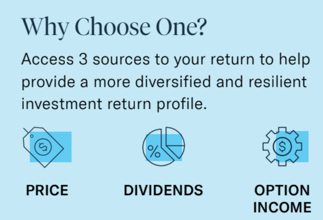 As shown below, market conditions and volatility typically impacts total returns, highlighting the need for diverse return strategies to mitigate risk and help capitalize on fluctuations. Utilizing three income streams—price appreciation, dividends, and option income—can boost performance potential, especially in volatile markets. Option income generally rises with volatility, helping to buffer against negative price movements and typically offering a more resilient return profile.
