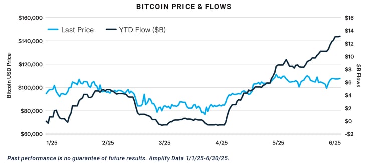 Crypto continues to see strong momentum in 2025 with institutional adoption deepening and investor interest surging. Corporations, particularly Bitcoin treasury companies, have continued to acquire Bitcoin, while spot Bitcoin ETFs* have seen robust inflows. In fact, the fourth largest ETF for inflows in 2025 is a spot Bitcoin ETF. Likewise, Bitcoin’s price has climbed from approximately $94,000 to over $107,000 as of June 30, 2025 and over $119,000 as of July 14, 2025.