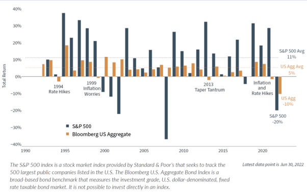 What has made this year challenging is that both stocks and bonds have performed poorly. This is because the sudden jump in rates due to inflation has hurt all asset classes at the same time. This bucks the normal pattern of bonds supporting portfolios in difficult markets.